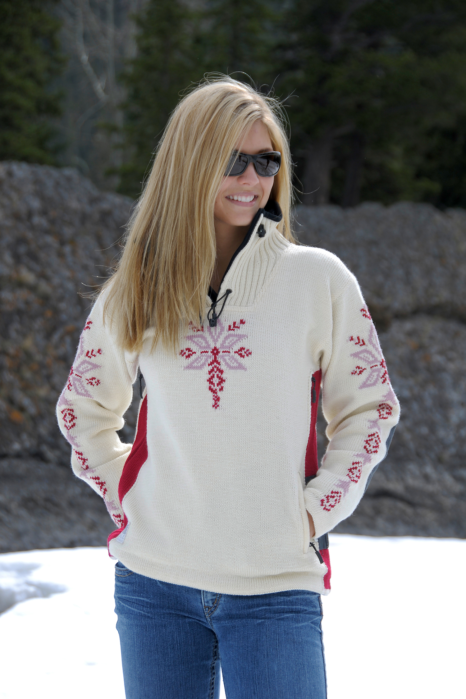 OMG, this sweater is beautiful. Super warm and heavy, perfect for the powder days. I like that it's not overly ski-lodge looking as it has only a little snowflake pattern on the chest and little bit on the sleeves. I use it pretty much instead of sweater and jacket, undershirt and this sweater and I'm good to go. Powder skirt keeps the snow from getting in and high collar keeps me warm too.