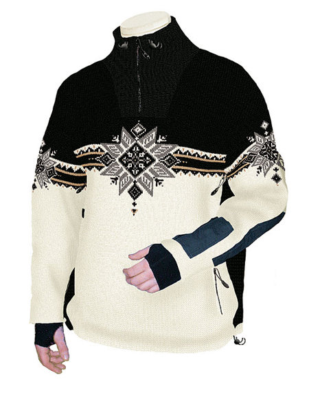 Pretty nice piece of technical outerwear Dale came up with. The entire sweater is treated with Teflon which makes it water repellent. Try to pour water on it and it will literally just bead off, something unheard of for a wool sweater. More so, the sweater is lined with a Gore windstopper membrane which makes it 100% windproof. There are zippers on the side for venting and there is pocket for credit card, ski pass or whatever. Pretty high neck, so you don't need scarf or bandana. I am using this sweater for skiing on a nice days and thin underwear under the garment is all I need. The sweater is nice and warm, probably thanks to the winstopper membrane. Not the cheapest sweater out there, but you really don't need a jacket to go with it (just a thin shell in your packpack for when it gets nasty.)