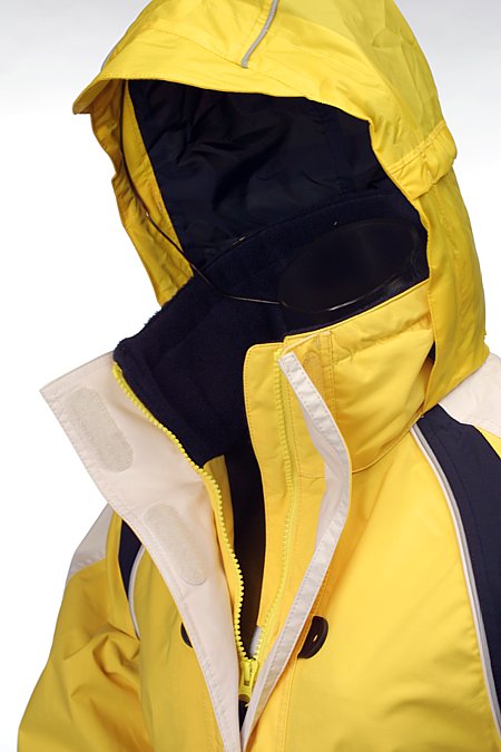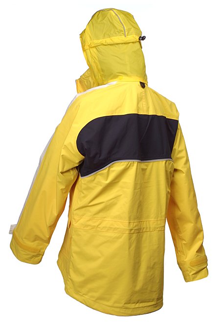 Helly Hansen sailing and boating enthusiast jacket. Protective rubber-laminated inner cuffs with wrist adjustment. Two waterproof front pockets with fleece-lined handwarmer pockets. Adjustable elastic drawcord at back waist and hem. Fully lined, shaped hood in orange signal, packs into collar. Adjustable fleece-lined collar. Rubber loops for inflatable jacket. Designed for rugged conditions - protection in rough weather (persistent rain or snow, cold, wind).