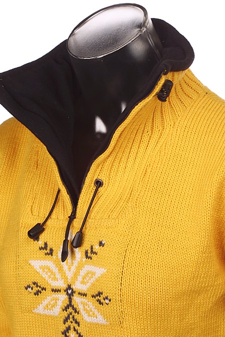 OMG, this sweater is beautiful. Super warm and heavy, perfect for the powder days. I like that it's not overly ski-lodge looking as it has only a little snowflake pattern on the chest and little bit on the sleeves. I use it pretty much instead of sweater and jacket, undershirt and this sweater and I'm good to go. Powder skirt keeps the snow from getting in and high collar keeps me warm too.